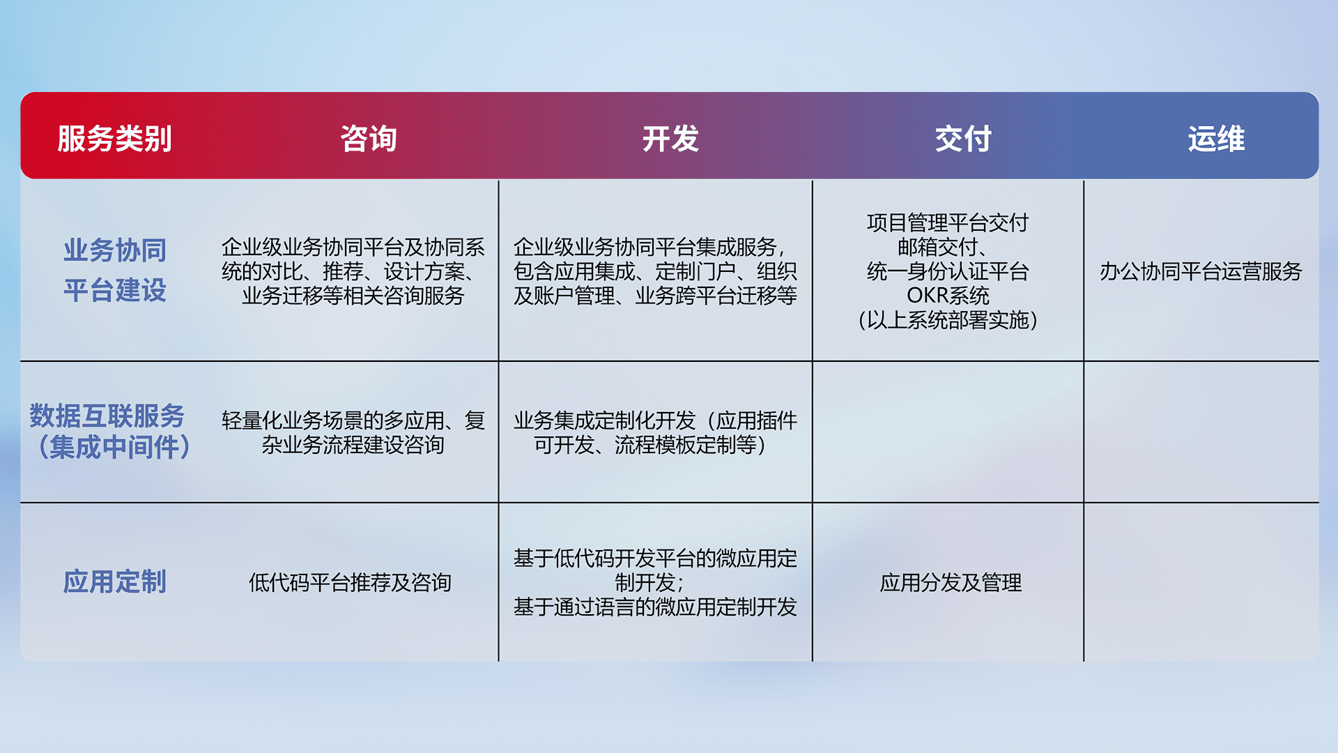 针对钉钉、、、、企微、、、、IDaas等平台级产品提供产品的规划、、方案、、交付、、、、定制化开发等服务,,实现如统一协同办公、、、、智能客户服务、、混合会议管理、、智能数据查询、、、、等业务场景,,,实现数字化转型。。。。