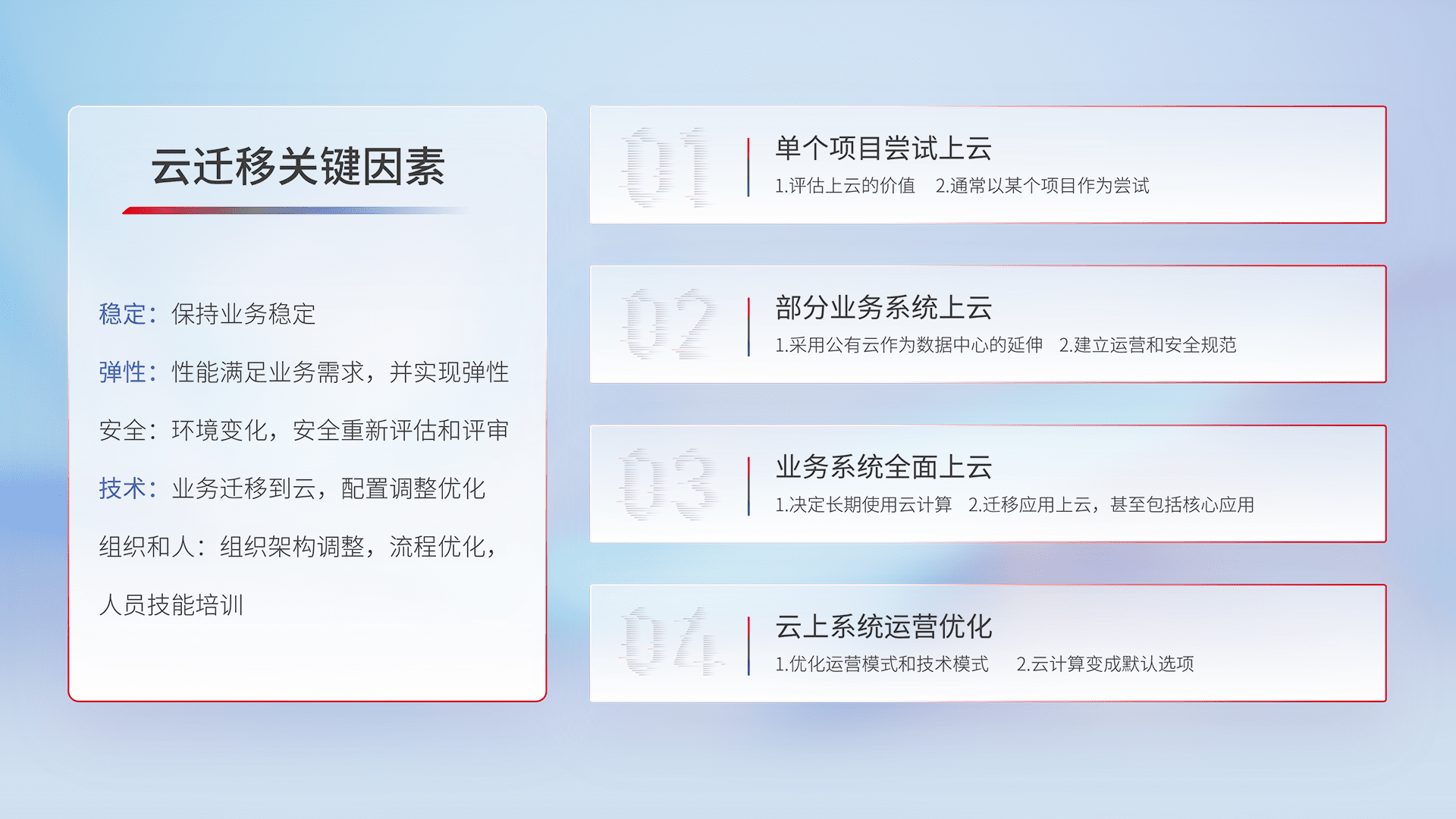 结合实际业务,,,,从规划设计、、、、云平台选型、、云原生改造、、数据迁移、、、集成交付,,迁移全过程为客户识别最佳上云路径,,做好风险识别管理,,,,设计网络架构、、、身份权限、、、安全审计合规、、、、操作审计、、日志审计、、、、监控告警策略、、、多站点容灾设计等,,,对云上基础设施进行整体规划,,,提升IT治理水平,,以满足弹性、、、高可用、、、高性能的需求。。
